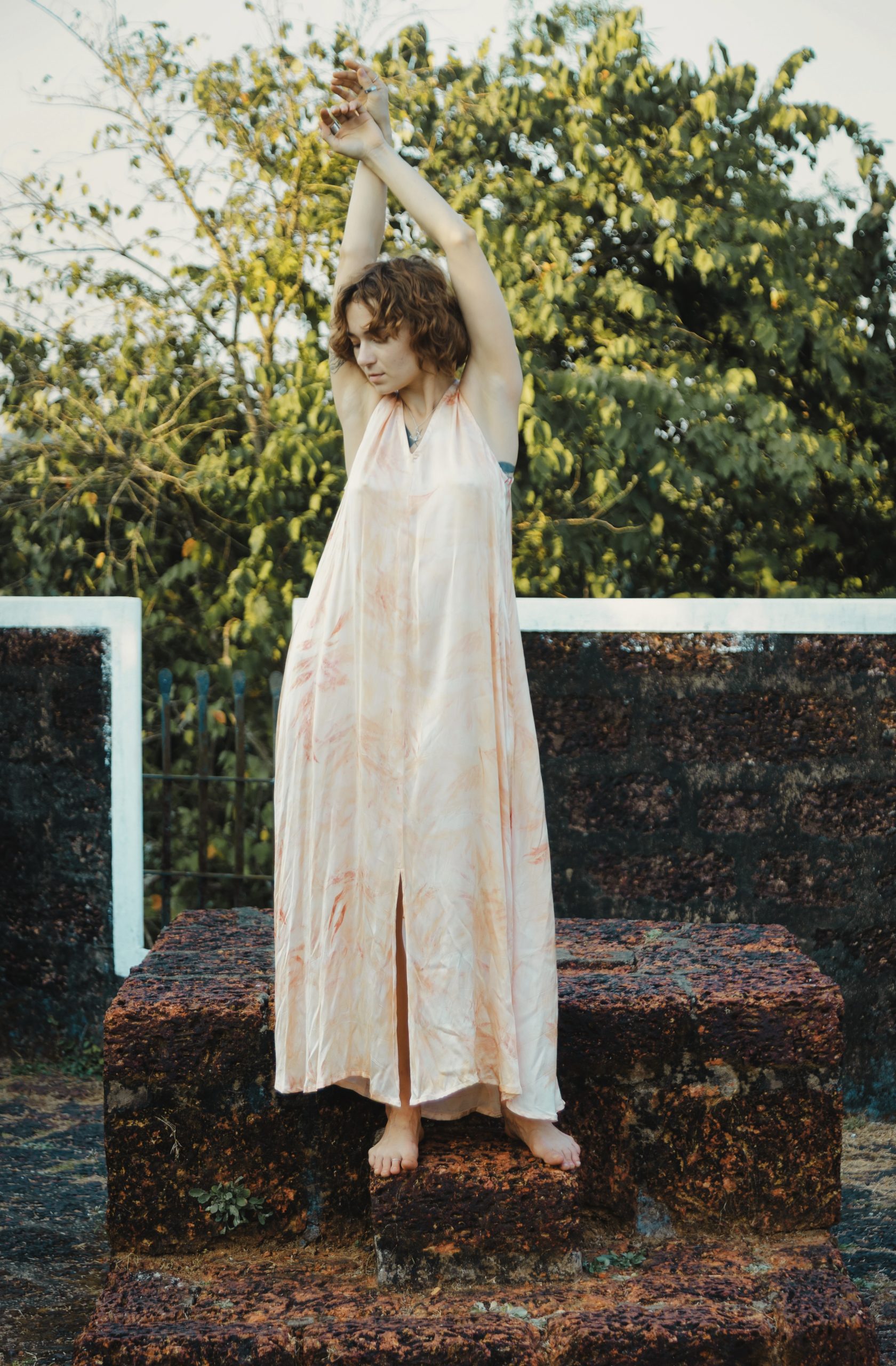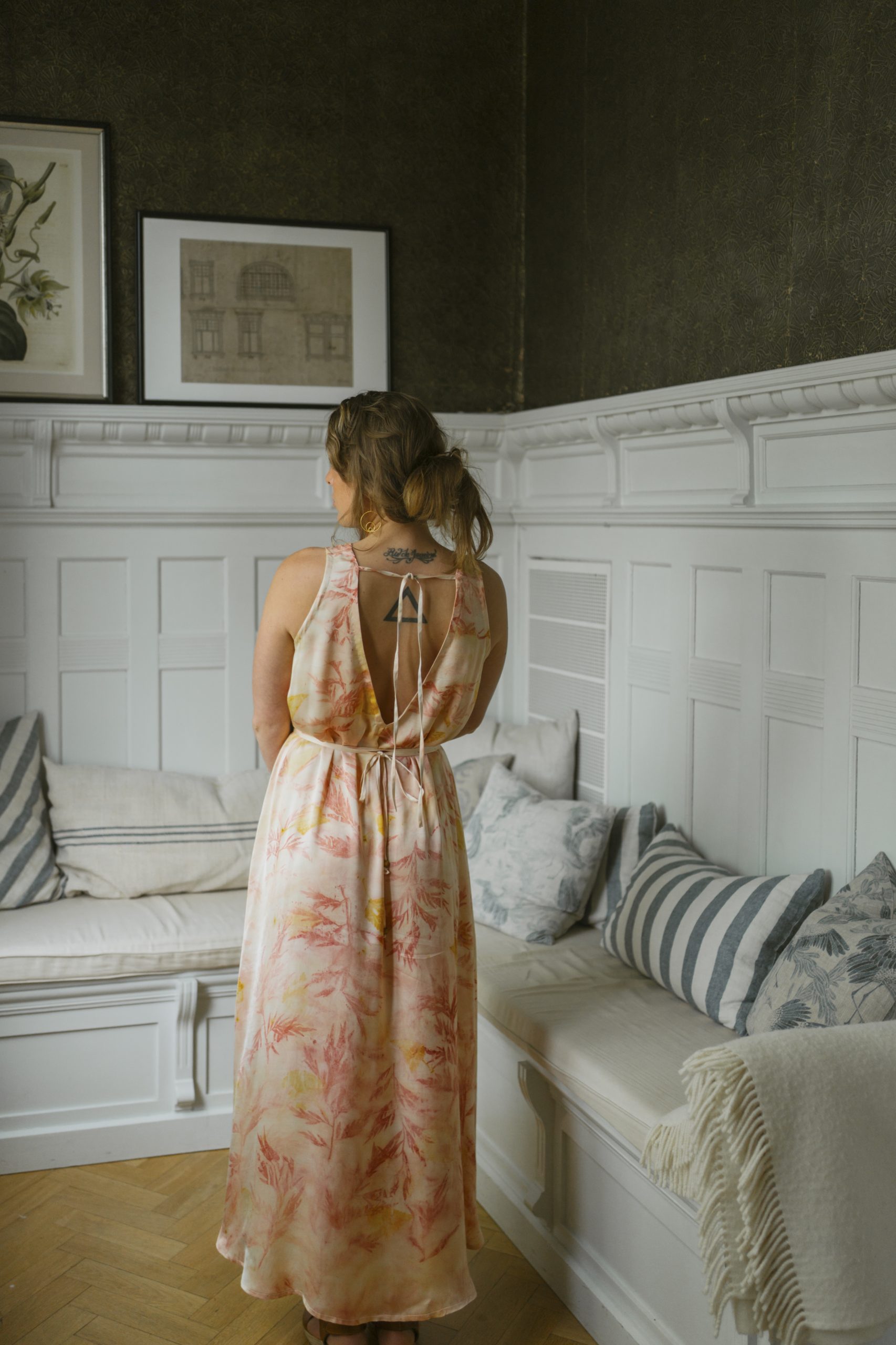 Varje plagg har tryckt förhand med säsongens blommor och blad av kvinnor. Vi arbetar med en etiskt driven verksamhet startad av en kvinnlig pionjär, vars mission är att bevara lokala hantverkstekniker.